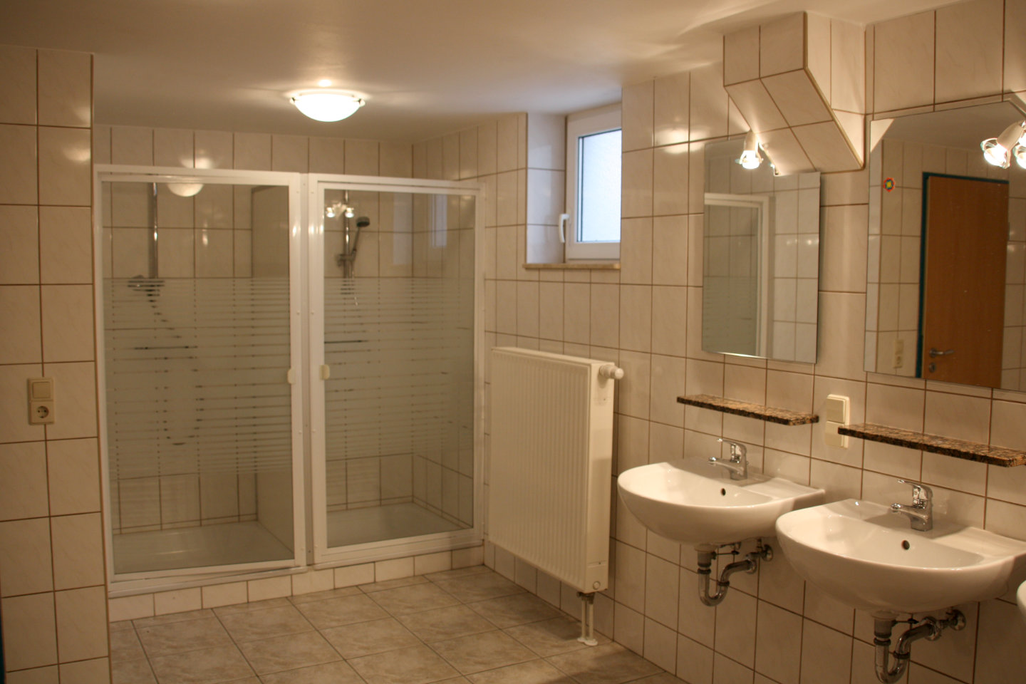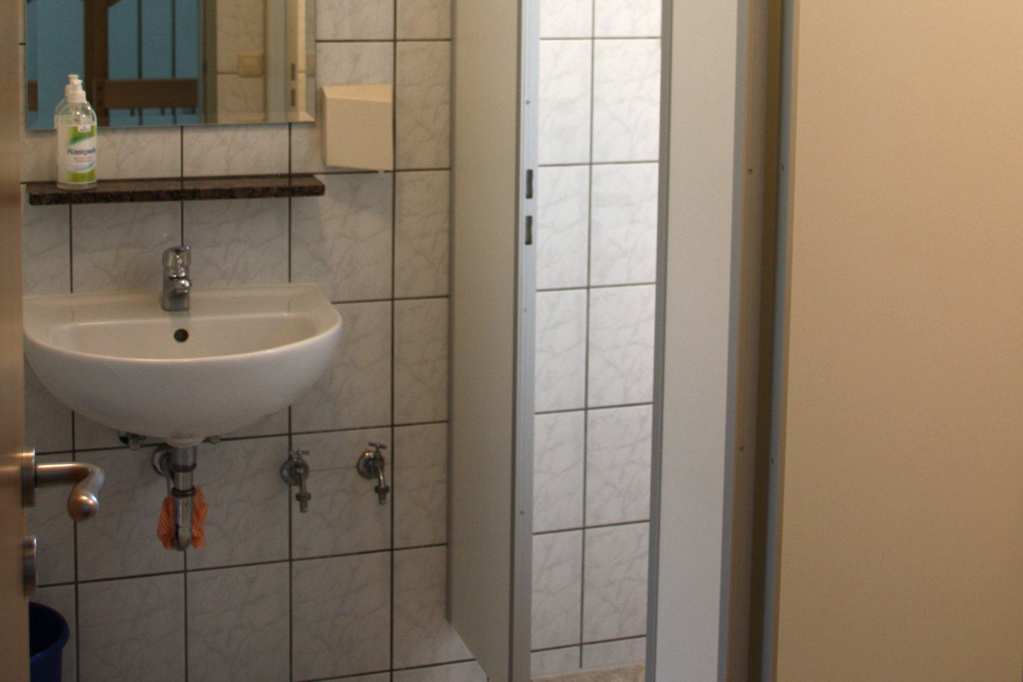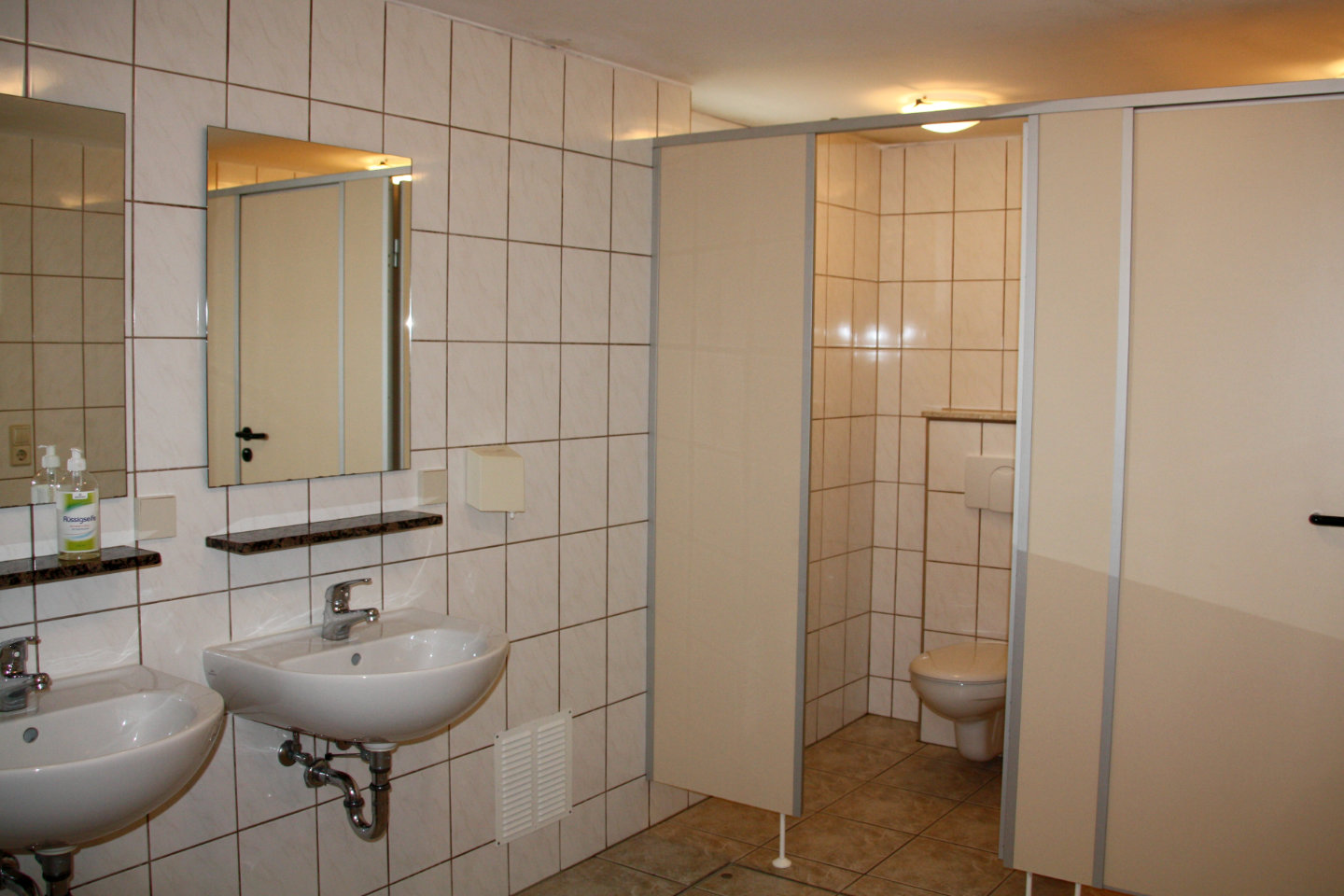 Im Haus befinden sich die sanitären Anlagen in Form eines Dusch- und Waschraumes mit drei Duschen für die Damen nebst einem gesonderten Raum mit mehreren Damentoiletten im Erdgeschoss. Im Keller sind sowohl die Herrentoiletten als auch der Wasch- und Duschraum (mit vier Duschen) für Herren vorzufinden.